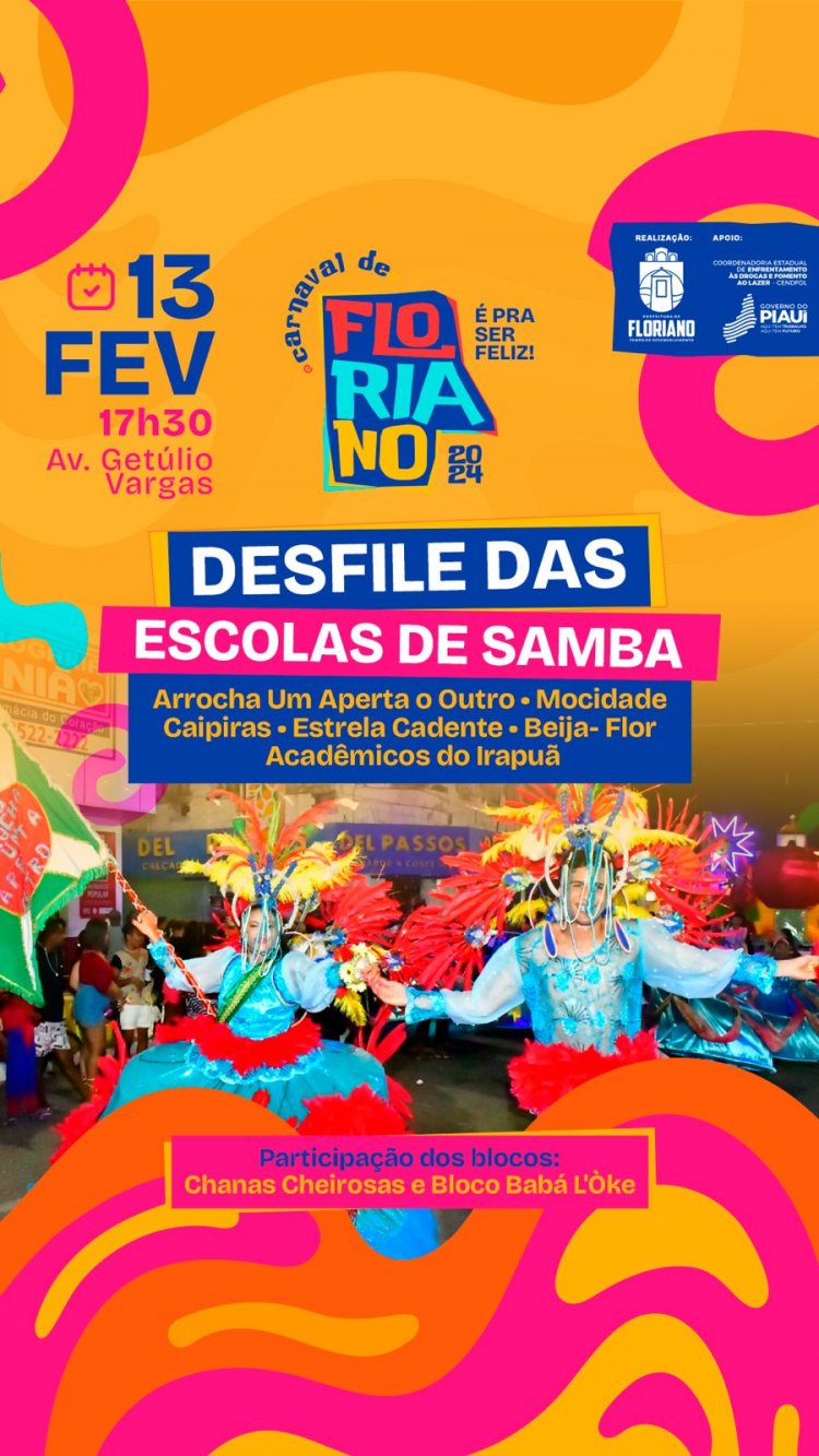 O desfile na Avenida Getúlio Vargas, considerado o corredor da folia de Momo em Floriano, está marcado para começar às 17h30 da terça-feira de carnaval, com um abre alas com a participação do tradicional bloco das Chanas Cheirosas, seguido do bloco Bàbá L'oke, organizado pelo grupo afro Yle Asé Bàbá L'oke.